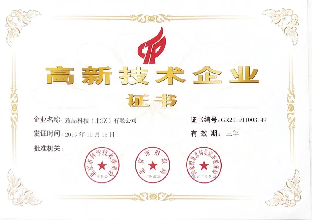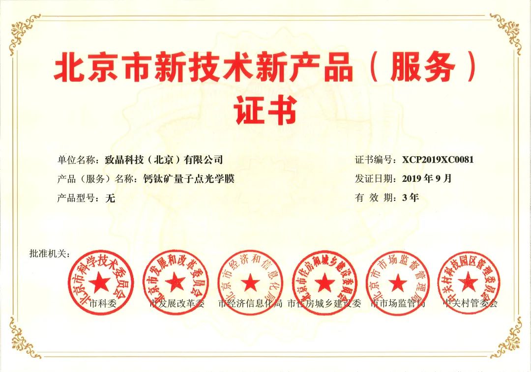 公司一路走来荣获多个重要奖项:2016年获得北京市科技新星计划路演推介会优秀项目奖和最具产业化前景奖;2017年获得北京市纳米之星创业大赛二等奖、“最具投资价值奖”;2018年获得全球科技创新暨博士后创业大赛二等奖、第七届中国创新创业大赛国际第三代半导体专业赛全球总决赛优胜奖;2019年获得中关村前沿技术创新大赛智能制造和新材料TOP10;公司的创新能力获得政府部门认可,2019年获批中关村高新技术企业、国家高新技术企业、国家“专精特新”企业,并承担中关村颠覆性技术研发及成果产业化项目;2020年获评为高聚人才企业,获中关村金种子企业,Perovskite-info报道致晶与TCL合作量产的500台,确认致晶为钙钛矿商业化全球第一的事实;获评SID年度最佳创新显示组件银奖、视听健康-技术创新奖、视听健康-体验创新奖;海高赛、新高赛三等奖;北京创新创业大赛季成长组三等奖;2021年SID年度最佳创新显示模组组件金奖,湾高赛TOP50奖等。