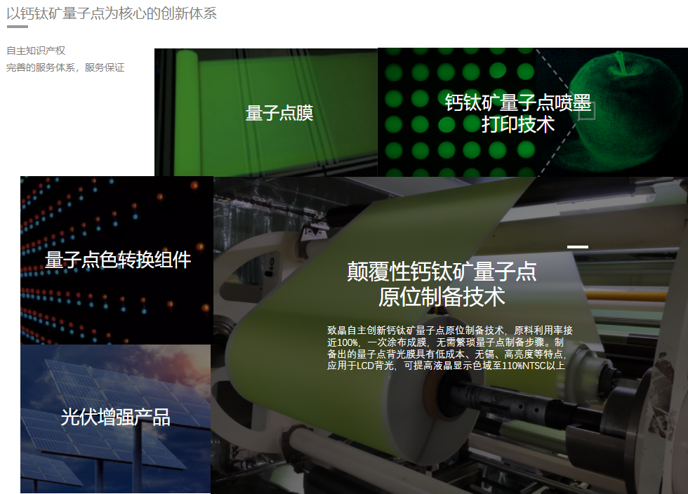 致晶科技拥有全球首创的钙钛矿量子点原位制备技术,提供了量子点集成应用的颠覆性材料和工艺,是世界上首家推出商用钙钛矿量子点光学膜产品的开发商和供应商。2018年与合作伙伴首次推出全球首款搭载钙钛矿量子点光学膜的55寸电视样机,在美国全球消费电子展(CES 2018)、全球显示技术展(SID 2018)展出,获得行业内的高度关注,2019年产品进入工程应用阶段。至2020年,已接触显示行业客户200余家,并向国内外多家显示巨头提供样品进行产品适应性测试,产品性能初步获得客户认可。2021年开始小批量出货,并推动TCL千台级TV产品出货量产,以及通过了BOE、创维等大客户的测评,完成了审厂阶段。