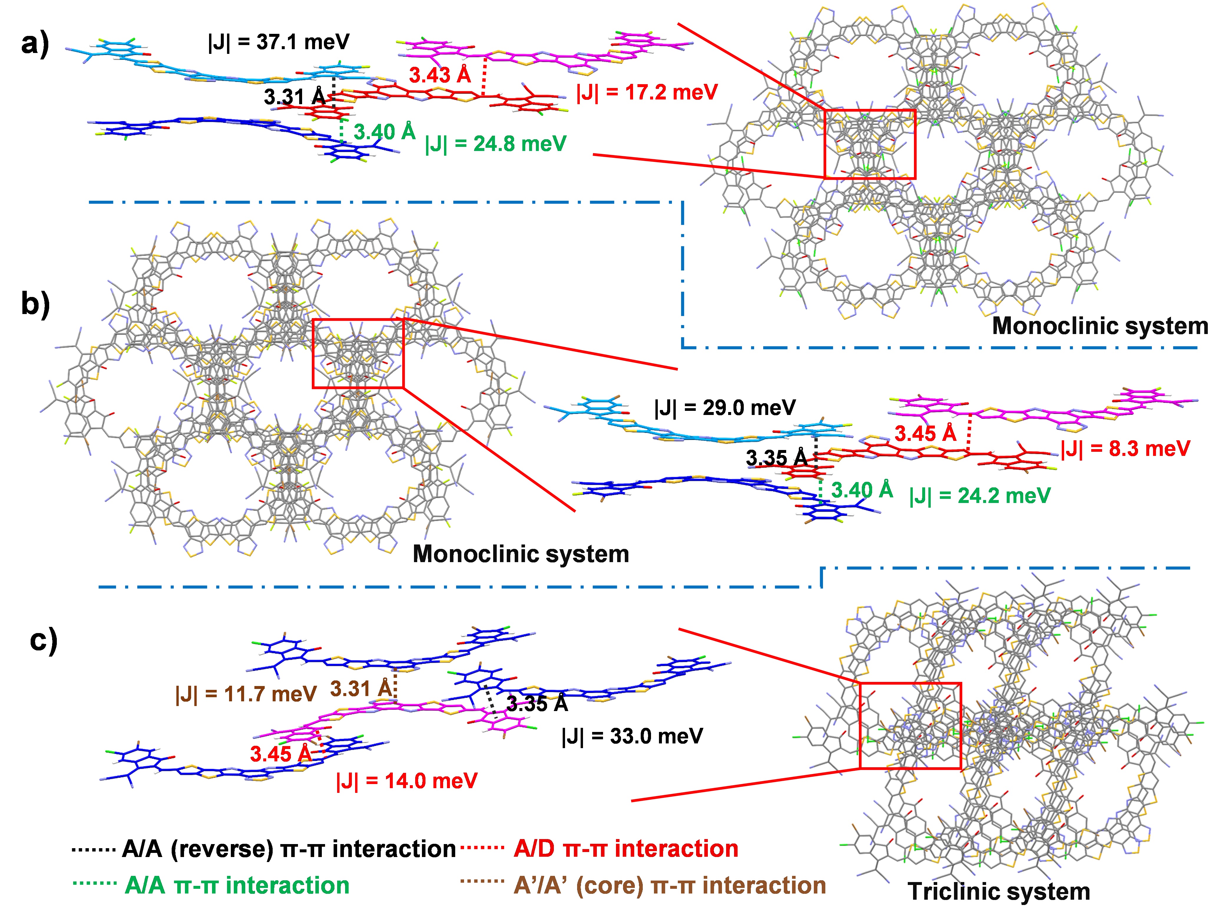 图2 三种异双卤化端基所修饰的受体分子材料。a) Y-BO-FCl; b) Y-BO-FBr; c)Y-BO-ClBr的分子结构、分子间晶体堆积模式和距离、分子间相互作用耦合量化参数对比。