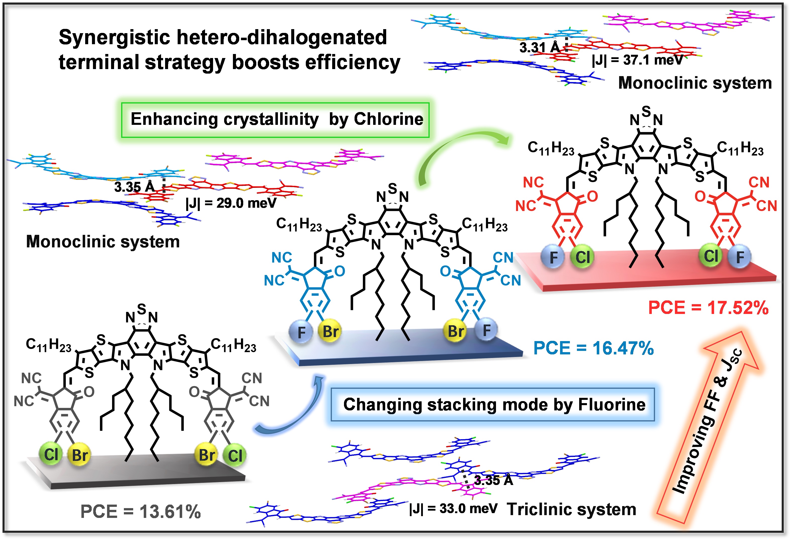 图3 三种异双卤化端基所修饰的受体分子材料的分子结构、晶体堆积差异和太阳能电池性能之间构效关系图