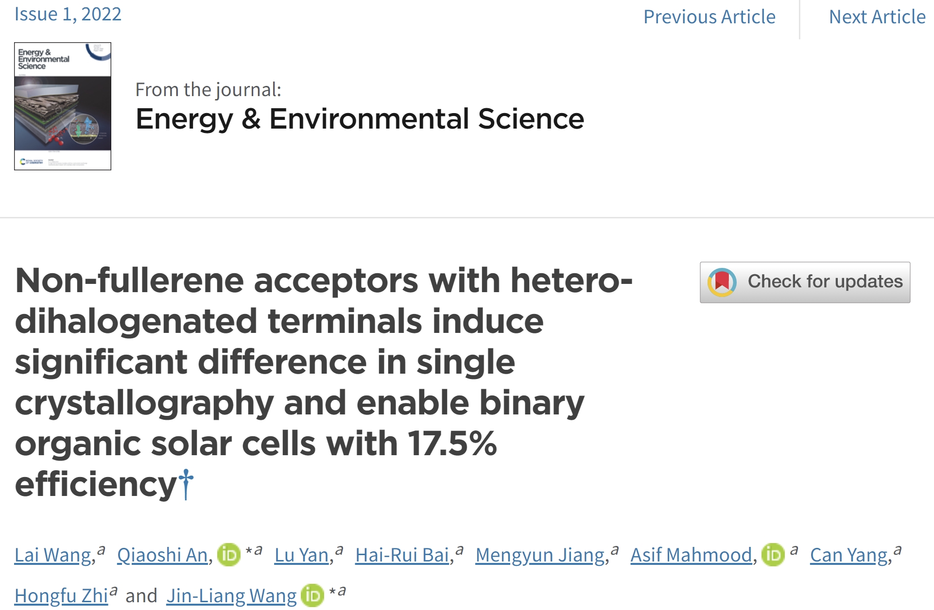 日前,北理工团队在基于异双卤代末端基的聚合物太阳能电池受体材料领域取得进展,相关研究成果以“Non-fullerene acceptors with hetero-dihalogenated terminals induce significant difference in single crystallography and enable binary organic solar cells with 17.5% efficiency”为题,发表在国际顶级能源期刊《Energy & Environmental Science》上(2022, 15 , 320-333)上。化学与化工学院硕士生王来为该论文的第一作者,化学与化工学院王金亮教授和安桥石特别研究员为共同通讯作者,永利yl23411为唯一通讯单位。