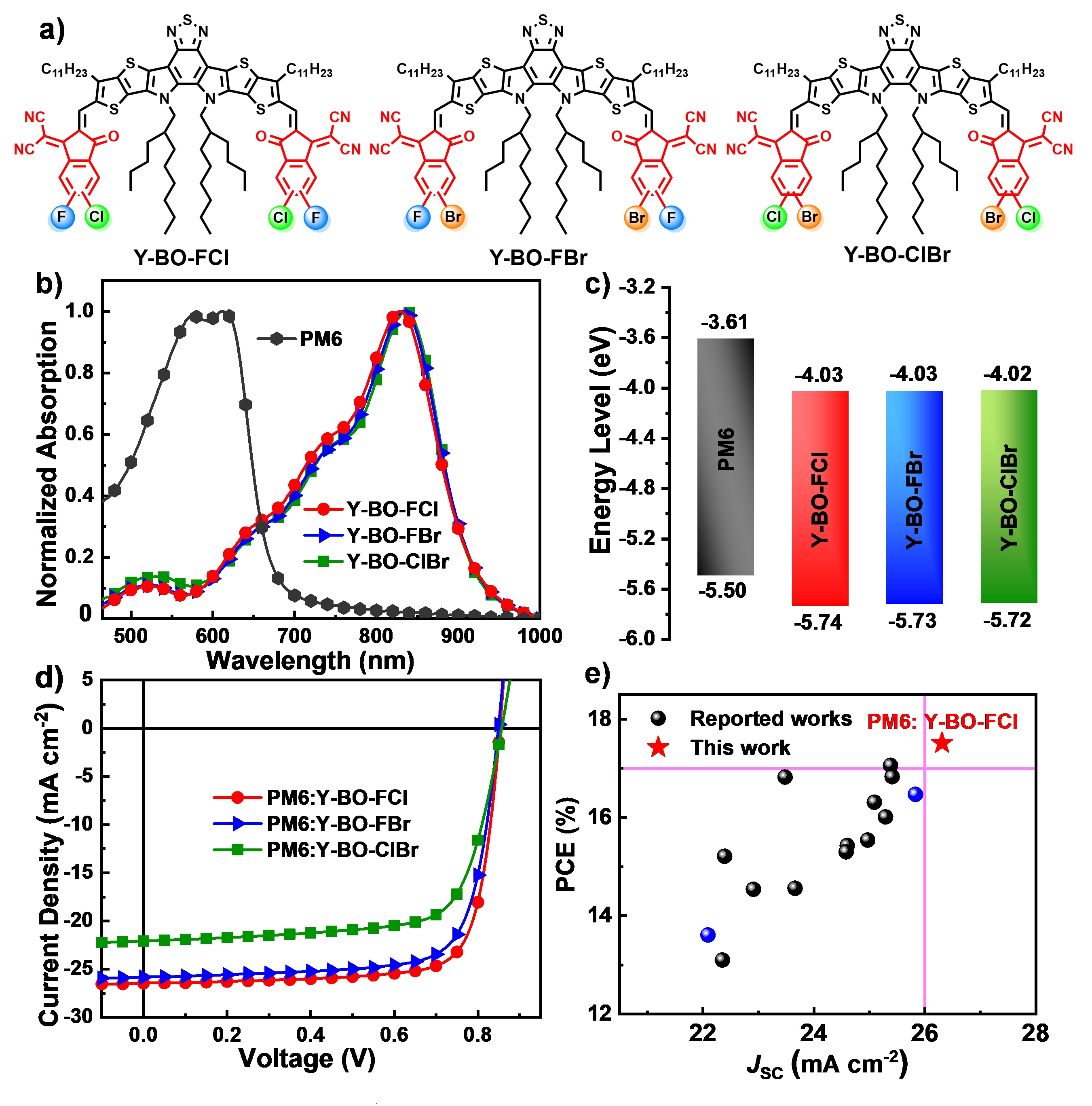 图1 (a)三个受体材料分子结构; (b)薄膜吸收光谱对比; (c) 分子前线轨道HOMO和LUMO能级图对比; (d)器件的J-V曲线; (e)受体分子Y-BO-FCl与其他已报道各种异卤素端基修饰的受体材料的二元电池性能统计对比图。