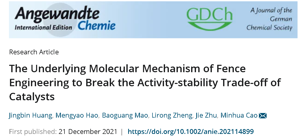 论文详情:Jingbin Huang,+ Mengyao Hao,+ Baoguang Mao,* Lirong Zheng, Jie Zhu, and Minhua Cao*. The Underlying Molecular Mechanism of Fence Engineering to Break the Activity-stability Trade-off of Catalysts, Angewandte Chemie International Edition, DOI: 10.1002/anie.202114899. 论文链接:https://doi.org/10.1002/anie.202114899
