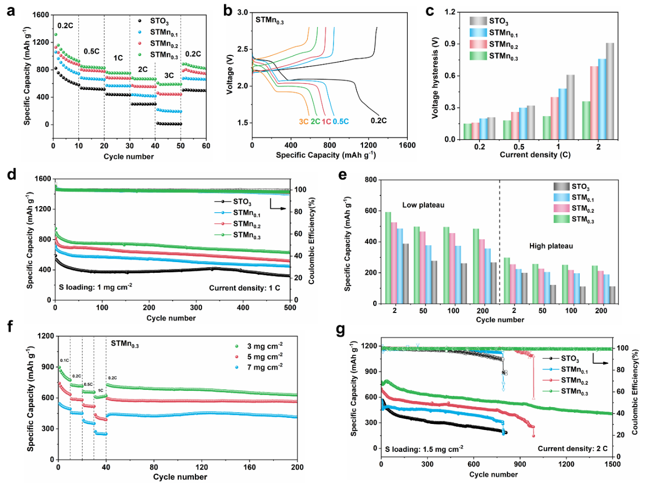 在国家自然科学基金委的支持下,我校化学与化工学院王振华教授和孙克宁教授团队在前期的研究基础上,基于缺陷化学理论,选择具有吸附性能和电化学稳定性的钛酸锶基钙钛矿氧化物作为基底材料,对钛酸锶基钙钛矿氧化物Sr0.9Ti1-xMnxO3-δ (STMnx) (x=""0.1-0.3)进行了氧空位浓度的调控,改善其吸附-催化性能,实现了高性能锂硫电池。以具有较高氧空位浓度的STMn0.3作为正极载体的锂硫电池,在2C下进行1500次循环后仍可提供780" mAh g-1的高初始比容量和0.032%的低衰减率。这种氧空位的定量调控策略对缺陷材料的设计与调控具有启发意义,可在锂硫电池及相关储能与转换系统领域推广应用。