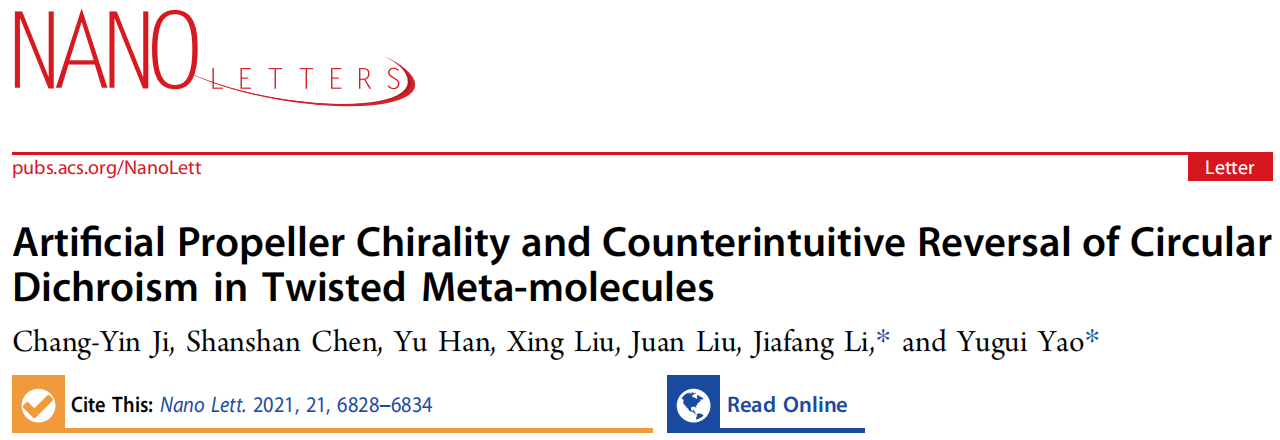 文章信息(#为共同一作;*为通讯作者):Chang-Yin Ji, Shanshan Chen, Yu Han, Xing Liu, Juan Liu, Jiafang Li,* and Yugui Yao*, “Artificial Propeller Chirality and Counterintuitive Reversal of Circular Dichroism in Twisted Meta-molecules”, Nano Letters 21, 6828-6834 (2021).