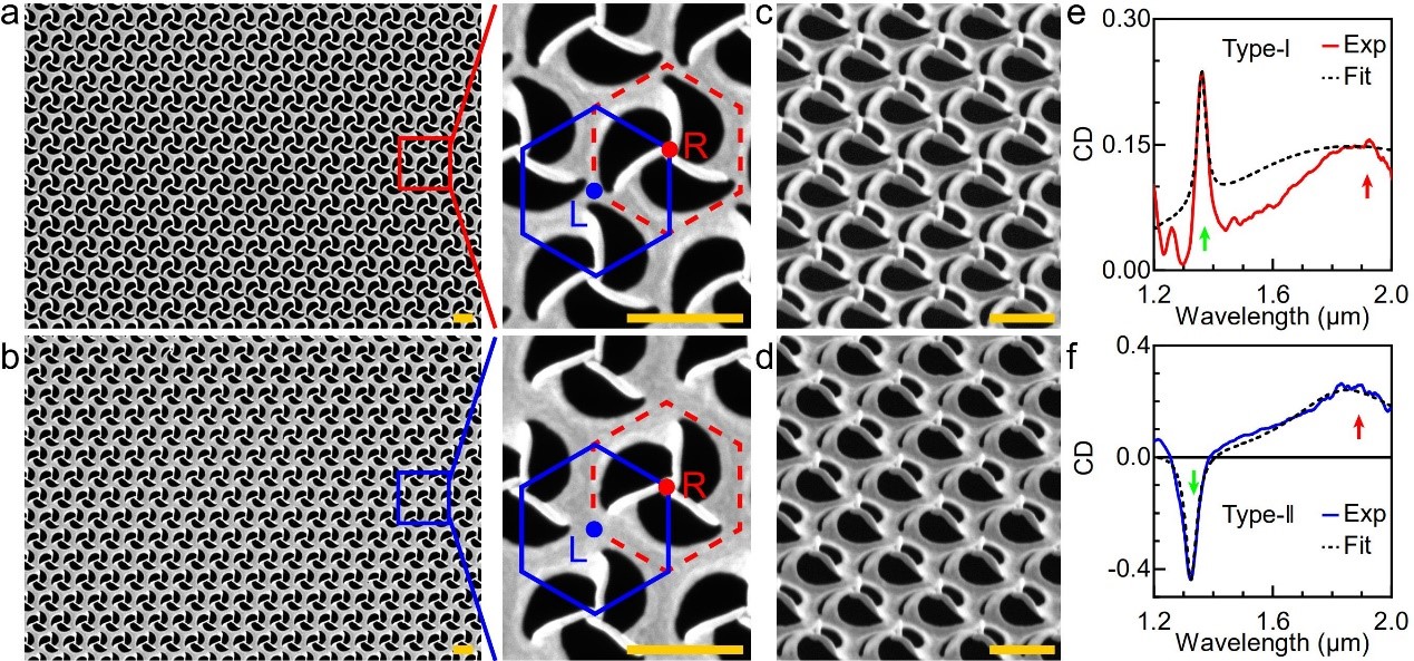针对这一难题,研究团队采用自主发展的纳米剪纸技术[Sci. Adv. 4, eaat4436 (2018), Adv. Mater. 32, 1907077 (2020), Nat. Commun. 12, 1299 (2021)],通过引入微扰构建了两个几乎一致的双几何手性人工旋桨超分子阵列结构,实现了圆二色性剧烈的符号反转。理论分析表明,该反直觉的圆二色性符号反转是由相位控制的手性电四极矩激发与表面晶格共振放大效应导致的手性竞争引起的。