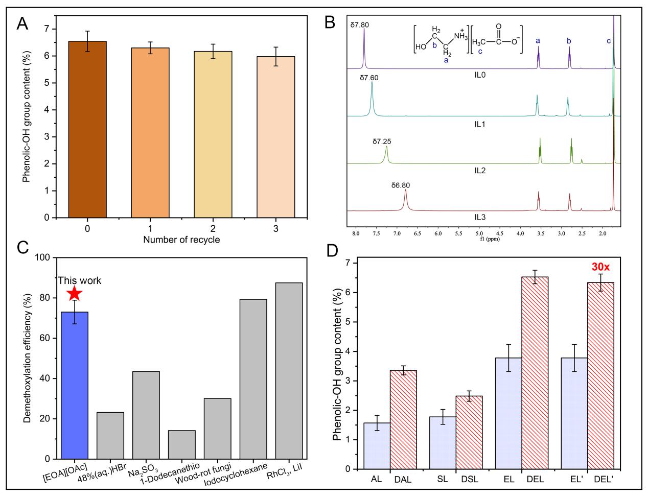 图3. A) 循环产物中的酚羟基含量;B) 回收PIL的结构稳定性;C) 不同方法的木质素脱甲基化效率对比;D) 不同类型的木质素脱甲基化效果。