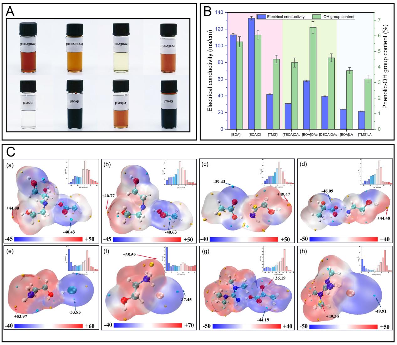图2. A) 选用的8种PILs;B) PILs的电导率及脱甲基化产物的酚羟基含量;C) 8种PILs的表面静电势分析。