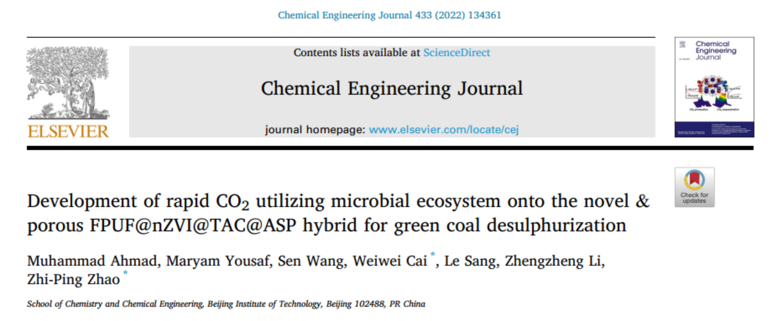 近日,北理工化学与化工学院先进功能膜与膜过程团队在煤炭生物脱硫及CO2捕集方面取得重要研究进展,相关研究成果以“Development of rapid CO2 utilizing microbial ecosystem onto the novel & porous FPUF@nZVI@TAC@ASP hybrid for green coal desulphurization”为题发表于化工顶级权威期刊《Chemical Engineering Journal》(影响因子13.273),文章第一作者为化学与化工学院博士后Muhammad Ahmad,通讯作者为赵之平教授和蔡玮玮副研究员。