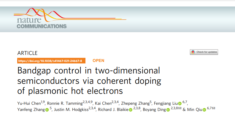 日前,永利yl23411物理学院张向东教授课题组青年教师陈宇辉研究员与新西兰维多利亚惠灵顿大学、奥塔哥大学,以及北京大学和西湖大学的研究者开展合作,在表面等离子体光学腔和二维半导体二硫化钨的复合体系上,通过利用光和物质强耦合效应,在实验上实现了对二硫化钨的高效热电子掺杂,大幅改变了二硫化钨原有的带隙,相关研究成果发表在国际顶级期刊《自然·通讯》上。