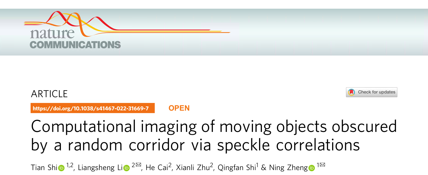 近日,永利yl23411物理学院郑宁教授团队和北京环境特性研究所的李粮生研究员团队,在《Nature Communications》发表题为 “Computational imaging of moving objects obscured by a random corridor via speckle correlations” 的文章。团队提出了一种新型的散斑关联方法,实现了对随机走廊(包含随机介质的曲折走廊)中隐藏目标的成像,同时定量分析了该方法的成像适用范围。永利yl23411的博士研究生石天为论文的第一作者,郑宁教授和李粮生研究员为论文的共同通讯作者。论文的合作者包括永利yl23411的史庆藩教授,北京环境特性研究所的工作人员蔡禾和朱先立。