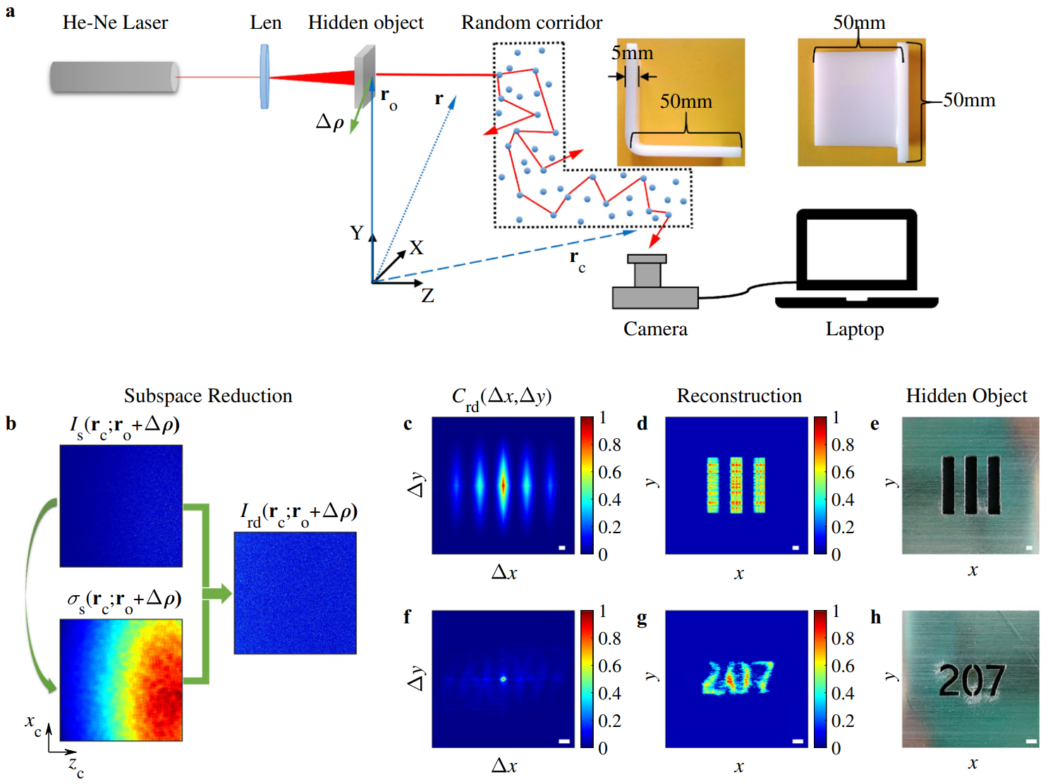 图1 成像位于随机走廊一个拐角后的隐藏目标。a 实验成像系统原理图。b 激光散斑光强照片子空间约化示意图。c,f 散斑光强关联函数。d,g 重建出的隐藏目标图像。e,h 隐藏目标实物照片。