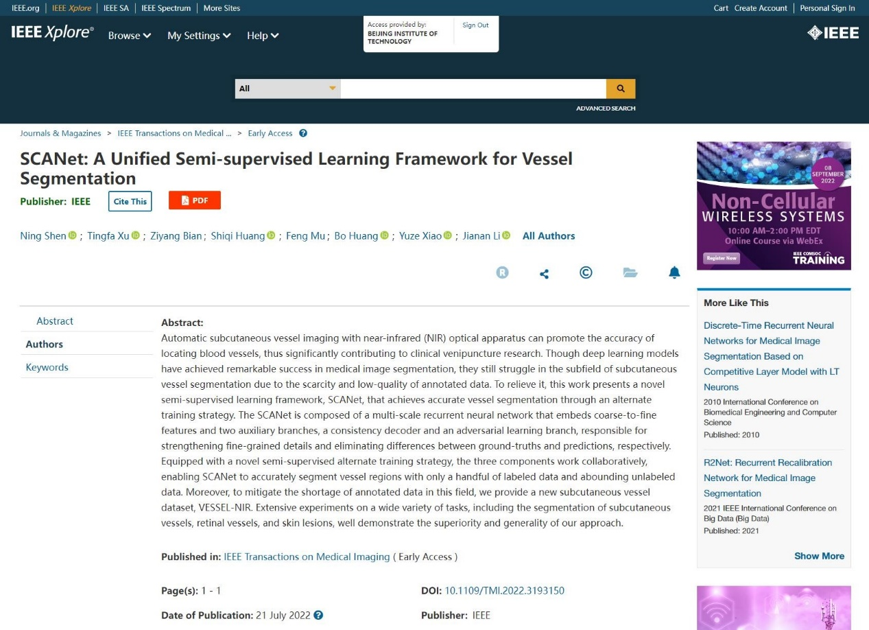 近日,永利yl23411光电学院许廷发教授科研团队在红外静脉血管医学图像处理领域取得新突破,相关研究成果以“SCANet: A Unified Semi-supervised Learning Framework for Vessel Segmentation”为题发表在医学图像处理领域的国际顶级期刊IEEE Transactions on Medical Imaging(IEEE TMI,IF="11.037)。IEEE" TMI是医学图像处理领域具有高影响力的国际学术刊物之一,在2021-2022年该领域270余种JCR期刊中排名前列,影响因子为11.037,中科院一区,主要发表和报道医学图像处理和分析、可视化和性能等领域的最新原创研究成果。该工作第一作者为永利yl23411光电学院博士研究生沈宁,通讯作者为永利yl23411光电学院李佳男特别副研究员和许廷发教授。