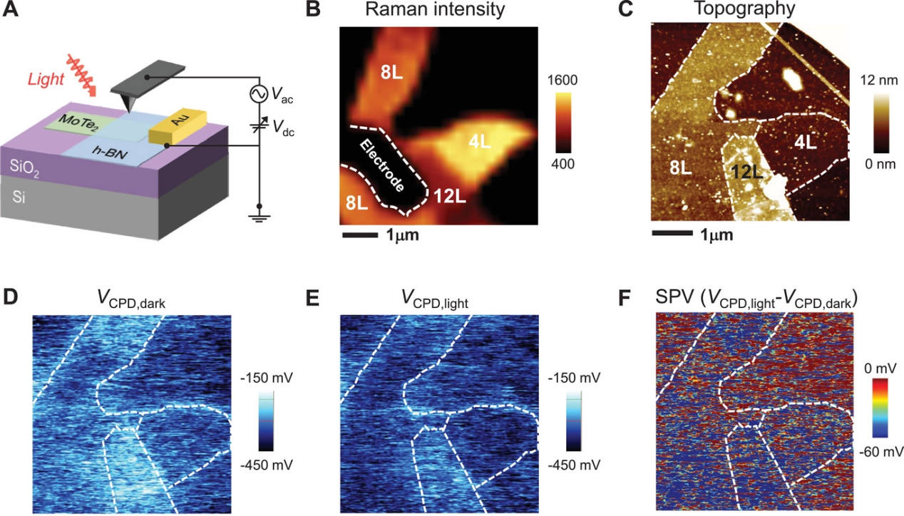 图3. 表面光电压表征。(A)用于研究接触电位差(VCPD)的KPFM基测量装置的示意图。(B)拉曼强度成像。(C)形貌图像。(D&E)在黑暗条件和λ=""635"" nm光照下的接触电位差(VCPD)成像。(F)SPV成像,由VCPD在黑暗条件下和光照条件下的差异定义。
