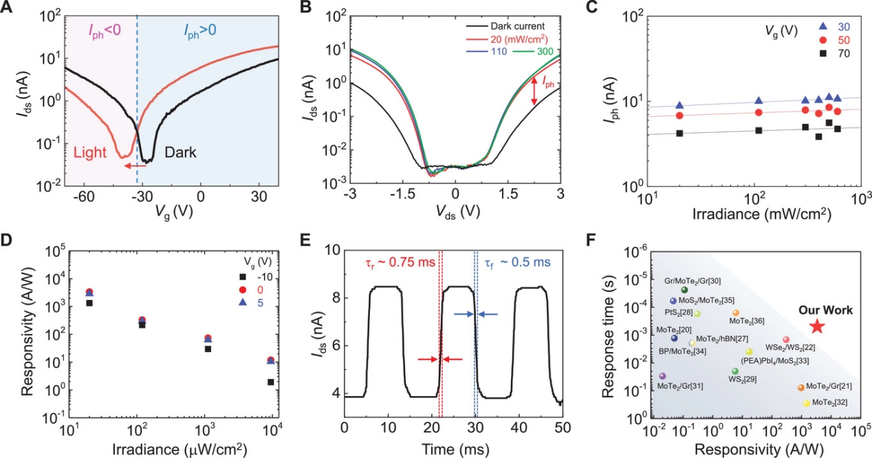 图2. 隧穿光电晶体管性能。(A)黑暗条件和光照条件下的转移曲线。(B)在黑暗条件和三种不同功率激光照射下,Ids与Vds的关系。(C)在Vg=""30、50和70V且Vds=3V时,光照下功率相关的光电流。(D)在三个不同栅极电压(λ=638nm)下,响应率与光功率密度的关系。(E)时域中的光电晶体管开关操作。(F)光电晶体管的响应时间和响应率的比较。