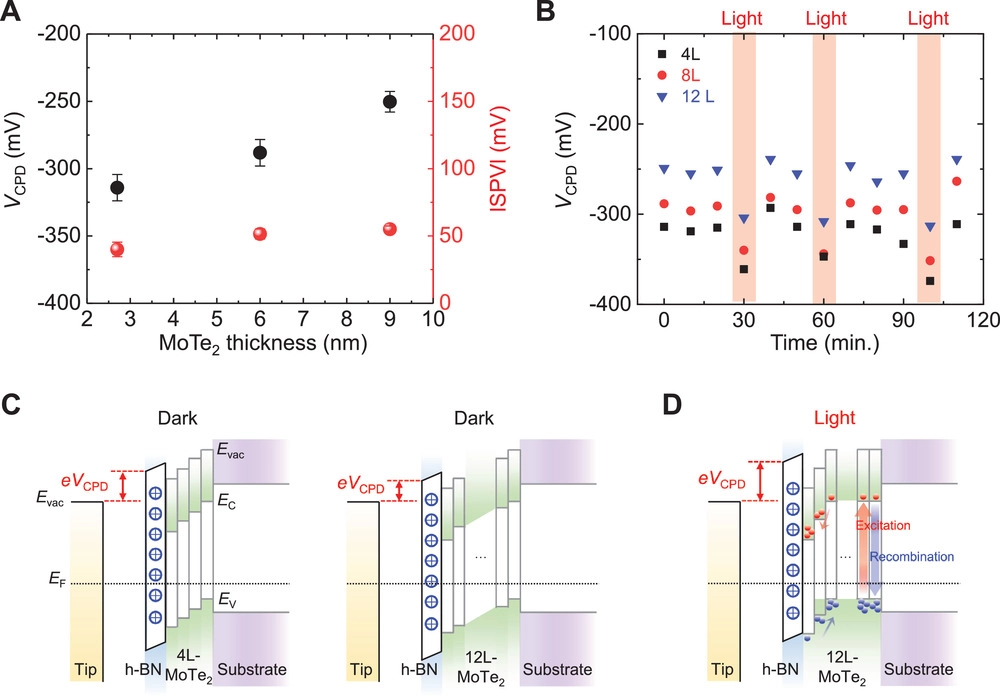 图4. SPV特性的解释和相应的能带图。(A)在黑暗条件下与MoTe2厚度相关的VCPD和SPV值。(B)在黑暗条件下和光照下,三种不同厚度(由h-BN层覆盖)MoTe2的时间分辨VCPD测量。(C&D)在黑暗条件和光照下,被h-BN层覆盖的4层和12层MoTe2的能带示意图。