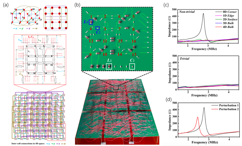 图2. (a)和(b)四维十六极子电路理论模型和实验样品图。(c).拓扑及平庸电路的阻抗测量结果。(d).不同缺陷对四维十六极高阶角态的影响。
