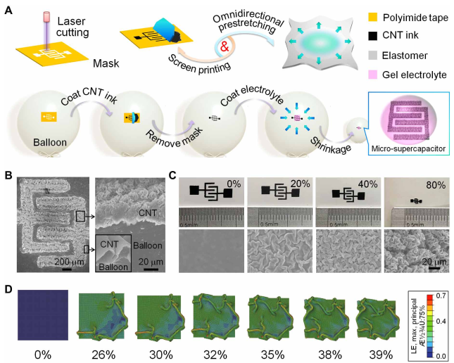 对于平面MSCs加工技术的优化,需要考虑如何使更多的电极材料在微尺度范围内尽可能多地暴露在电解液中。近年来,预拉伸策略在可拉伸器件中得到了广泛的研究,即覆盖在单轴或双轴预拉伸弹性体上的薄膜材料在衬底松弛后被压缩变形,形成紧密堆积的褶皱结构。实验结果表明,与块状结构相比,丰富的堆叠结构的存在可以在同一空间内提供更多的暴露表面积。因此,我们试图将丝网印刷方法与预拉伸策略相结合(图1),目的是在有限的图案区域内产生紧密堆积的活性电极表面。在不需要复杂固定装置的情况下,我们选择膨胀状态下的乳胶气球作为全向预拉伸弹性基底,弥补了传统预拉伸系统中拉伸方向的不均匀性。进一步选用力学性能优良、导电性高的碳纳米管(CNT)浆料作为可压缩电极材料。将CNT浆料刮涂到气球表面的电极掩模板上,然后通过移除模板形成图案化电极。值得一提的是,膨胀的气球球囊可以为掩模板和电极材料的附着提供足够的支撑,有效地降低了操作难度。在预涂一层凝胶电解质后,将气球放气收缩便轻松地得到了皱缩结构的MSC,实现了从宏观操作到微器件生产的一步转化。此外,全向收缩应力制备的微器件具有显著的保形性,可以实现多样化的器件设计。