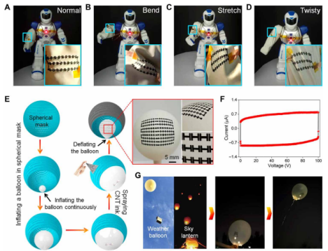 最后,我们利用弹性气球衬底,采用定制的球形掩模板研制出大规模球形集成微器件(图4),为加工具有挑战性的曲面微器件提供了突破性思路。一组面积仅为3.9 cm2的微型器件阵列可以产生100 V的高输出电压。之后,具有柔性和机械稳定性的微型设备可以承受一系列极端变形,并在可穿戴、可飞行的供电系统具有巨大潜能,这与其他微型柔性储能器件形成了鲜明的对比。总之,这些发现为开发高性能、突出形状适应和可穿戴的柔性微型储能器件提供了可拓展的设计思路。