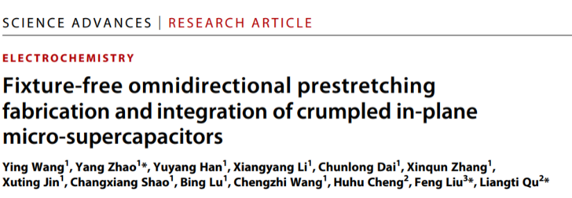 5月27日,永利yl23411化学与化工学院博士研究生王赢以第一作者身份在Science Advances期刊发表题目为“Fixture-free omnidirectional prestretching fabrication and integration of crumpled in-plane micro-supercapacitors”的研究论文。永利yl23411为第一通讯单位,永利yl23411化学与化工学院赵扬特别研究员、清华大学化学系曲良体教授和中国科学院力学研究所刘峰副研究员为共同通讯作者。本研究得到了国家重点研发计划项目、国家自然科学基金和北京市自然科学基项目等支持。