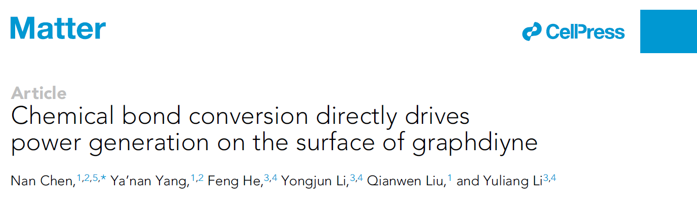 GDY中具有特殊分子结构和化学键的产电现象的发现,为能量形态变化的发展开辟了新的方向,促进了新能源的开发和实践。此外,感应电在未来有潜力用作能量转换和电能储存,以及用于快速检测和识别特定系统中的某些小分子。这一重要的研究成果以“Chemical bond conversion directly drives power generation on the surface of graphdiyne”为题发表在《物质》期刊上( Matter , 2022, DOI: 10.1016/j.matt.2022.06.045)。本工作得到了国家自然科学基金、北京市自然科学基金、永利yl23411创新人才科技资助专项计划(青拔)等多个项目的资助。文章的第一和通讯作者是陈南副教授,第一单位为永利yl23411。