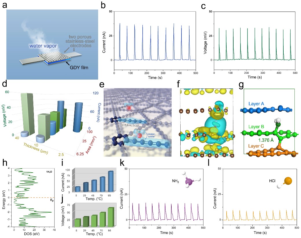 图2. (a-d) GDY薄膜发电装置的核心结构、产生规律的脉冲电信号的情况及影响因素。(e-h) GDY结构片段与H2O分子配位引起的电子转移和炔烃转化的机制示意图及相关理论计算。(i-l) 温度和分子种类对产电信号的影响。