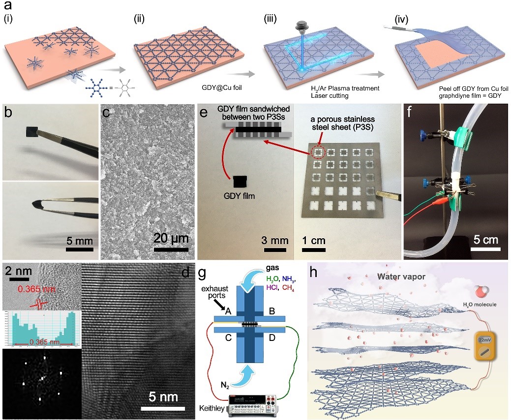 图1. GDY薄膜的制备和器件特性。(a-d) GDY薄膜的表征。(e-g) GDY薄膜装置的构成。(h) H2O分子穿过GDY框架结构的示意图。