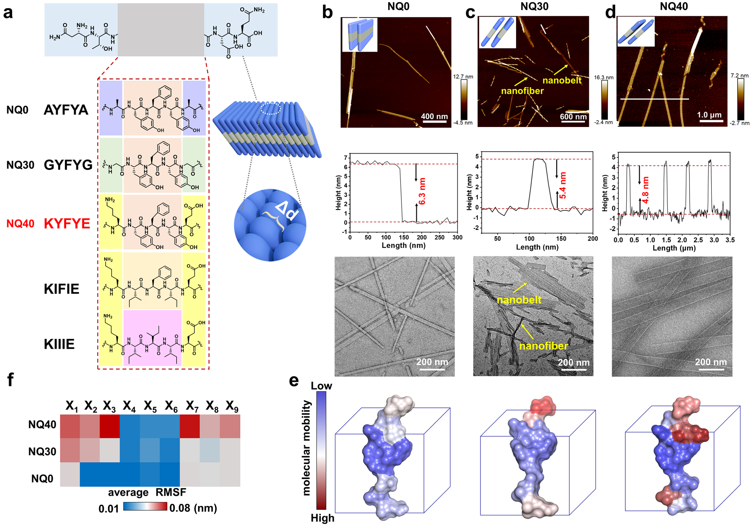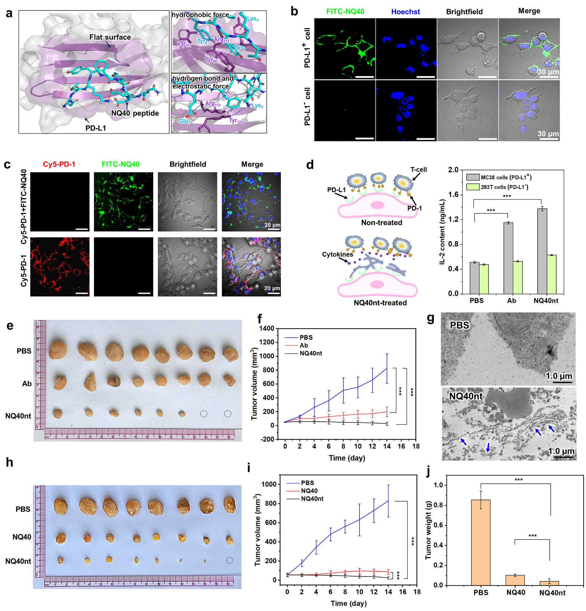 文章首先采用从头设计和“一珠一物”组合化学肽库微流控筛选的策略,得到了一条能特异性靶向免疫检查点PD-L1的Bola型多肽NQ30。通过对NQ30中亲疏水界面上残基的突变得到了极性不同的NQ0和NQ40两条多肽。组装结果表明,三条多肽形成了不同的形貌,其中NQ0形成了纳米带,NQ30形成了纳米纤维和纳米带共存的结构,而NQ40形成了均一的纳米管。