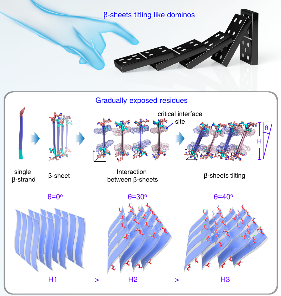 基于上述问题,王蔚芝课题组通过调控Bola型肽链的极性头基大小实现了相应组装体中β-折叠倾斜角度从0°-30°-40°的调控,类似于倒塌的多米诺骨牌。此外,β-折叠的倾斜能将部分活性残基侧链展示在组装体的表面可实现对免疫检查点PD-L1(程序性死亡配体)的识别,从而具有抗肿瘤的潜力。