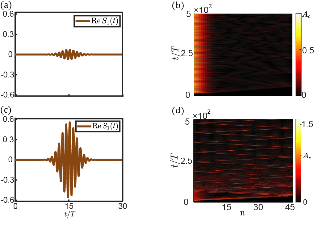 不同振幅的外界信号激励下,同样的非线性系统会表现出截然不同的拓扑物性。图1和图2分表描述了两种非线性拓扑体系。(图1)小振幅外界信号驱动下,体系处于非线性拓扑相。而大振幅外界驱动下,体系处于拓扑平庸相。(图2)小振幅驱动下,体系处于平庸相。大振幅激励下,体系处于拓扑相。