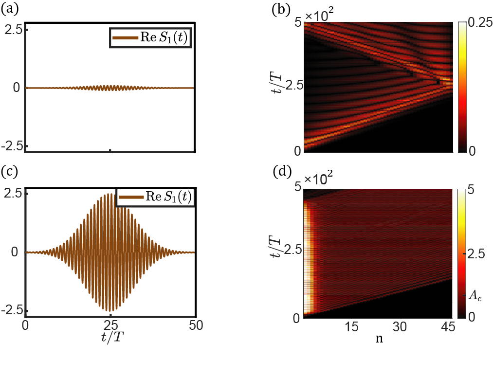 图1 小振幅拓扑、大振幅平庸的非线性系统。(a, b) 小振幅激励信号下,系统表现出拓扑边缘态响应。(c, d) 大振幅激励信号下,系统表现出体模响应。