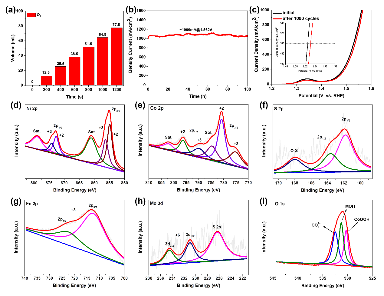 图4. (a) NCS@CFM0.075-LDH/NF在1A电流下实验测量的随时间变化的O2量。 (b) NCS@CFM0.075-LDH/NF在1000 mA cm-2电流密度时的稳定性。 (c) NCS@CFM0.075-LDH/NF在经过1000圈CV测试前后的OER极化曲线。(d-i) 经长时间OER测试后的NCS@CFM0.075-LDH的XPS谱图。