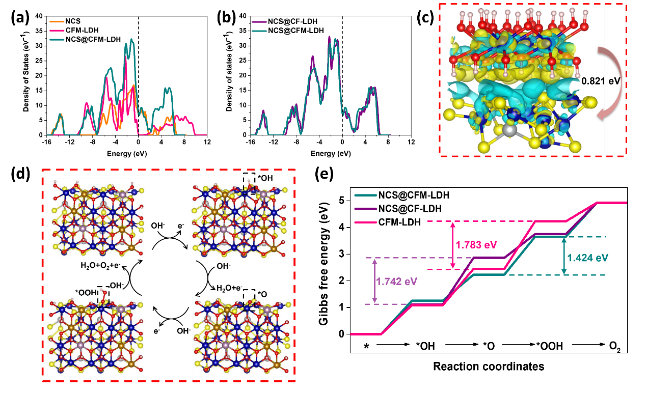 图5. 密度泛函理论计算。(a-b) NCS, CFM-LDH和NCS@CFM-LDH的DOS图。(c) NCS@CFM-LDH的差分电荷图。(d) NCS@CFM-LDH的OER四电子反应途径示意图。(e) NCS@CFM-LDH, NCS@CF-LDH和CFM-LDH的吉布斯自由能。