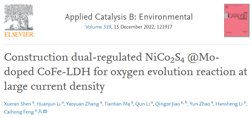 近日,永利yl23411化学与化工学院冯彩虹副教授团队在电解水制氢体系阳极析氧反应催化剂材料调控方面取得重要研究进展,相关成果以“Construction dual-regulated NiCo2S4@Mo-doped CoFe-LDH for oxygen evolution reaction at large current density”为题发表在化学类顶级国际期刊《Applied Catalysis B: Environmental》(影响因子24.319)。本文的通讯作者为永利yl23411冯彩虹副教授,第一作者为永利yl23411化学与化工学院专业学位硕士申雪然(现为该学院工程博士研究生),该博士生研究方向为工业化大电流电解水催化材料。