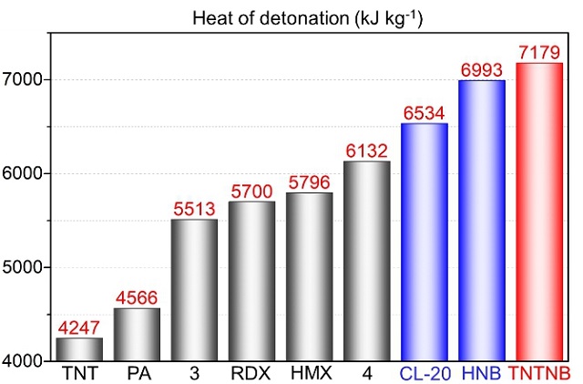 为了解决这一挑战,庞思平课题组创新性提出全硝基硝氨基协同策略,设计并合成出全硝基硝氨基取代的1,3,5-三硝基-2,4,6-三硝氨基苯化合物(TNTNB,图1),突破了CHON系含能材料能量难以提高的瓶颈。其爆热高达7179 kJ.kg-1,远高于HNB和CL-20为代表的第三代含能材料(HNB的爆热为6993 kJ.kg-1,CL-20的爆热为6534 kJ.kg-1),是目前能量最高的有机炸药(图2)。与HNB相比,TNTNB在水、酸、碱等溶液中都能够长期稳定存在,具有更高的稳定性。并且,发展乙酰化活化-硝化方法,在国际上首次实现对超惰性含能化合物三氨基三硝基苯(TATB)的硝化,成功攻克这个已困扰含能材料化学领域多年的技术难题。该研究成果为解决含能材料高能和安全之间的本质矛盾,设计发展新一代高能材料提供了新的思路和路径。