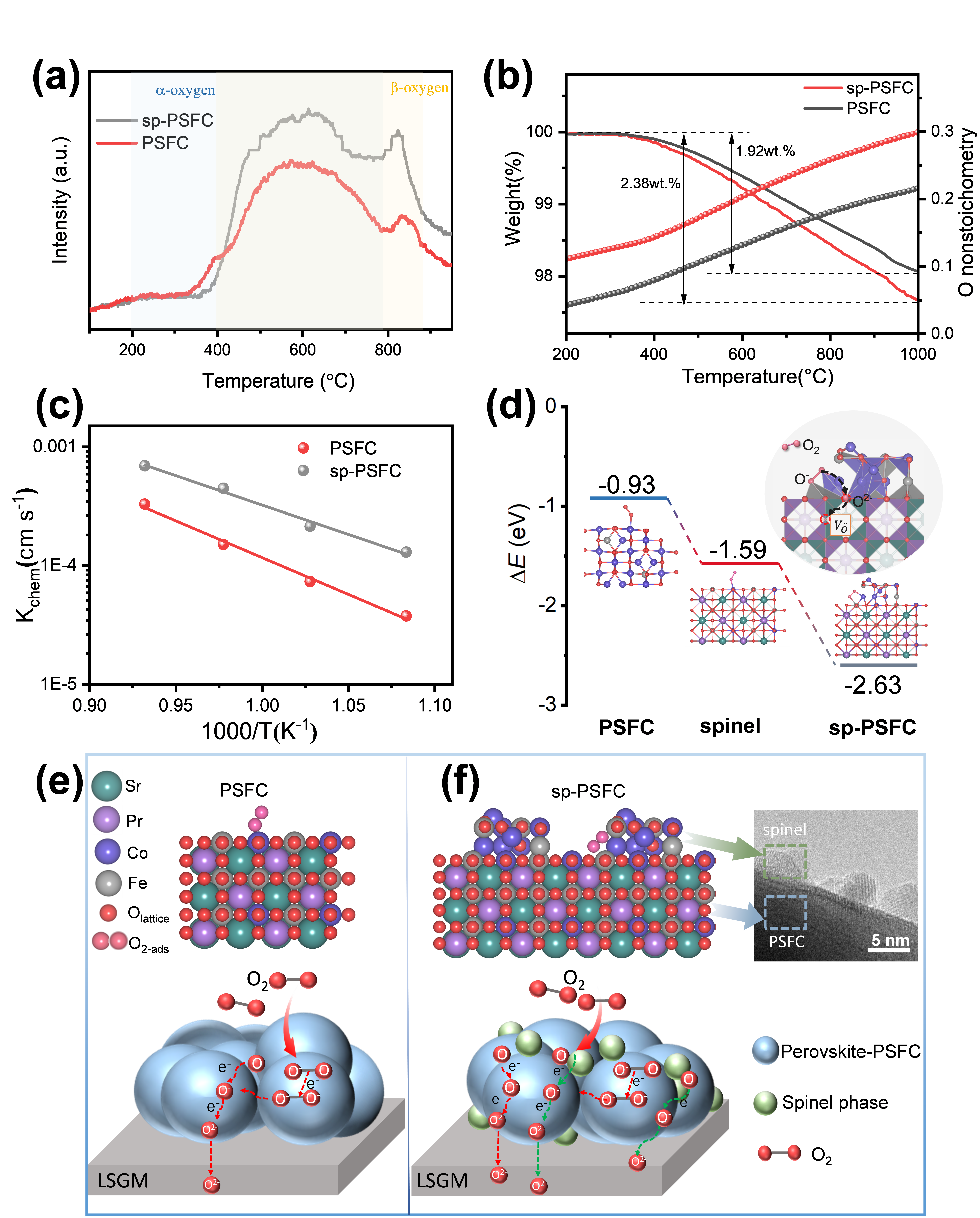 图1 sp-PSFC异质结的氧还原过程表征与机制。(a)程序升温脱附,(b)热重与碘量滴定,(c)表面氧交换速率,(d)利用第一性计算原理计算氧吸附能,(e)和(f)单相材料PSFC与复合异质结构材料sp-PSFC的结构示意图与氧还原机理示意图。