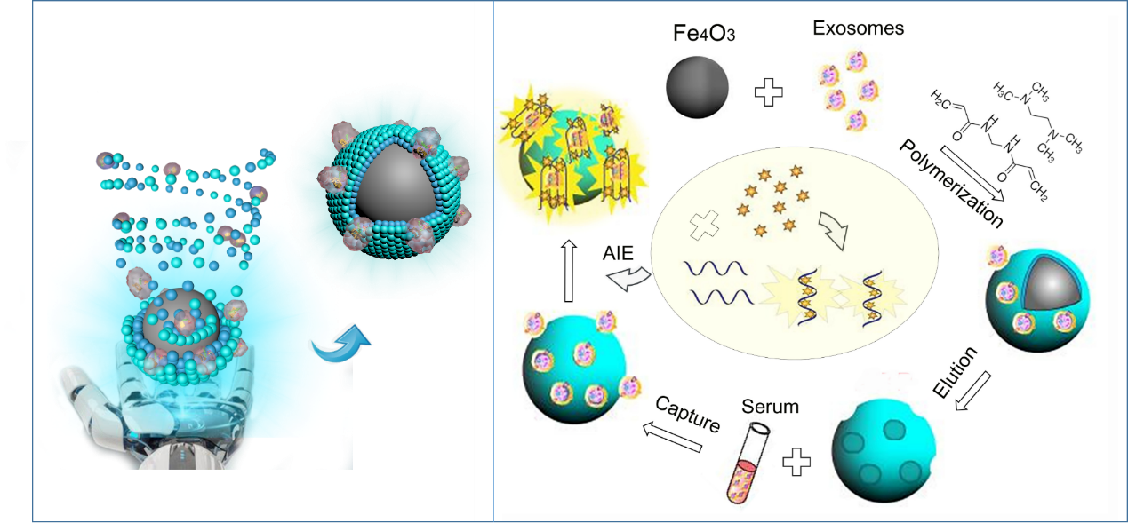 癌细胞来源的外泌体被认为是非侵袭性癌症诊断的潜在生物标志物之一,然而,不同肿瘤来源外泌体的表面性质尚不完全清楚,类似外泌体这样的复杂而性质不明的靶点限制了目前广泛应用的免疫等检测技术的使用。本课题组借鉴人工智能思路,提出了利用分子印迹技术中的化学自组装特性,在聚合体系中使用待检测的目标未知对象进行 “训练”,借助分子间作用力自组装搭建三维高选择高亲和性生物识别孔穴,将模板洗脱后,印迹孔穴即可用于未知或模糊目标的识别、分离或检测。不同于人工智能使用数据自主训练提取信息完成模型构建,本课题组建立了一种采用实物进行“自主训练”制备新型人工智能材料的方法。并在此基础上,分别利用适配体介导的聚集发光材料技术和适配体/石墨烯能量转移共振技术,建立了两种“Turn-on”型荧光传感检测新技术。外泌体检测灵敏度优于目前已文献报道的方法,该方法也初步实现了临床肿瘤患者血样和健康人血样的区分。同时,所建立的基于人工“定制”高选择性识别材料的方法,可通过简单地变换“训练”用模板,进而应用于其他未知目标的检测,具有普遍适用性。本课题组所建立的方法不仅扩充了分子印迹技术的应用领域,更重要的是提出了一种新型高选择性未知对象识别技术手段,方法简便高效,填补了相关技术空白,该方法同时在申请相关专利。(https://doi.org/10.1016/j.snb.2021.131182)(https://doi.org/10.1016/j.bios.2022.114112)。