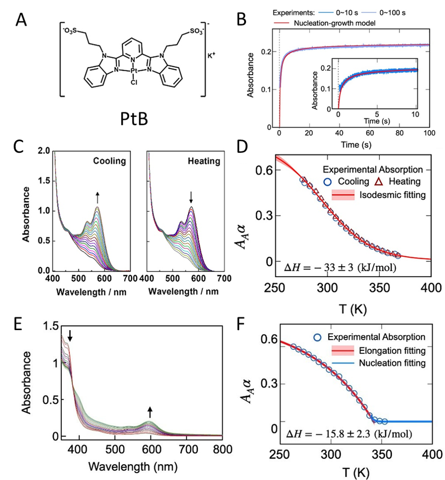 永利yl23411化学与化工学院李泽生教授团队的郑小燕副研究员、香港科技大学的黄旭辉教授和香港大学的任咏华院士合作对不同溶剂环境下两亲性Pt(II)配合物PtB的分子组装机制进行了系统的研究。由于分子间Pt···Pt相互作用会产生新的光谱信号,通过变温紫外可见光谱可获取平衡态PtB的组装体相对于单体的比例(α)随温度的变化,作者分别通过等键模型(Isodesmic model)和成核增长模型(Nucleation-Elongation model)拟合不同溶剂下PtB的α-T曲线来探索其分子组装体生长机制。研究发现:在纯水溶液中,α-T曲线符合等键增长模型,所得平衡常数分别为Ke300K = 2.4×103 M-1和Ke368K = 2.6×102 M-1;在丙酮和水混合溶液中,α-T曲线符合成核增长模型,所得平衡常数为Ke298K = 2.6×103 M-1和Ke328K = 1.4×102 M-1。同时成核过程对应的平衡常数为5.0×10-6。此外,作者通过Stopped-flow吸收光谱实验测定了PtB在丙酮和水混合溶液中的组装过程动力学。结果发现,实验数据符合成核增长模型:在t=""0.1s时,PtB具有1.1×10-6" M s-1的成核速率,随后成核速率急剧下降直至1.0 s时几乎可忽略不计。在t=""0.1s时,PtB的生长速率为10.6"" s-1,随着PtB单体被消耗和分子组装体间的融合,其生长速率逐渐降低。这一结果表明PtB在丙酮和水混合物溶液中的组装过程符合成核增长形成机制。