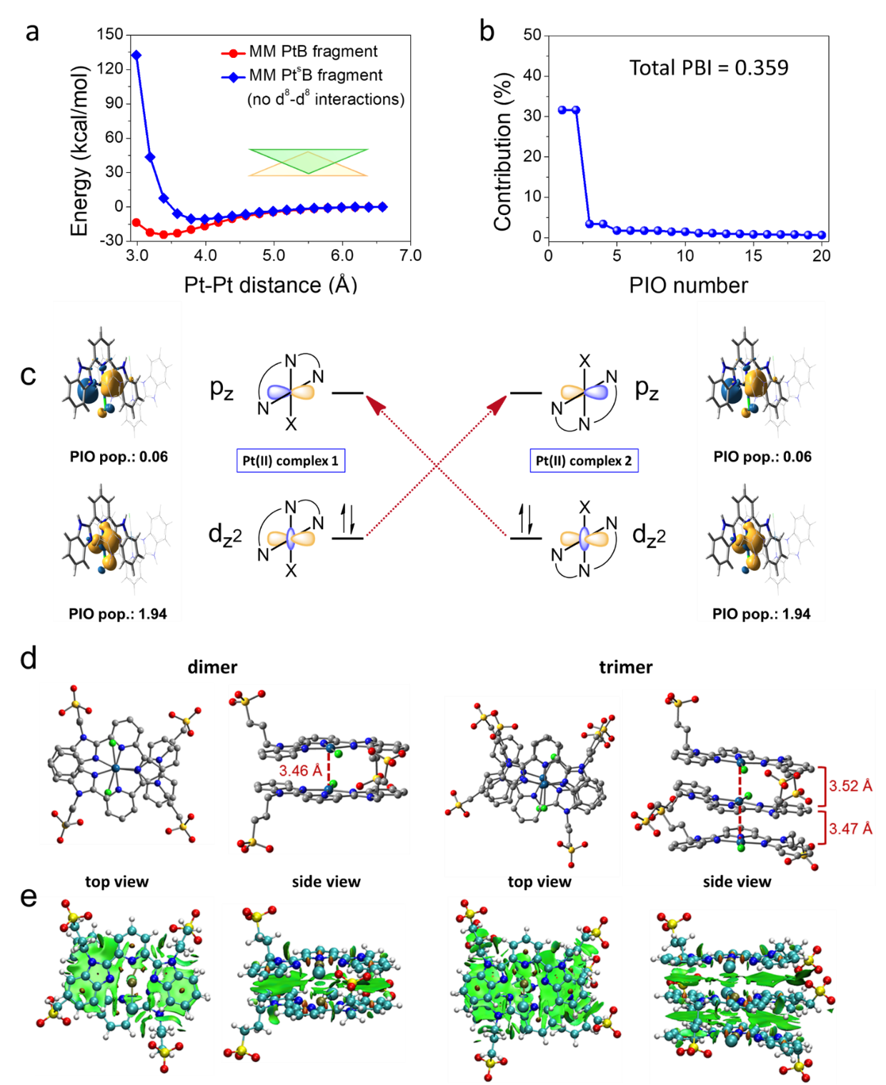 图3 Pt(II)配合物的主轨道相互作用和非共价分子间相互作用分析。