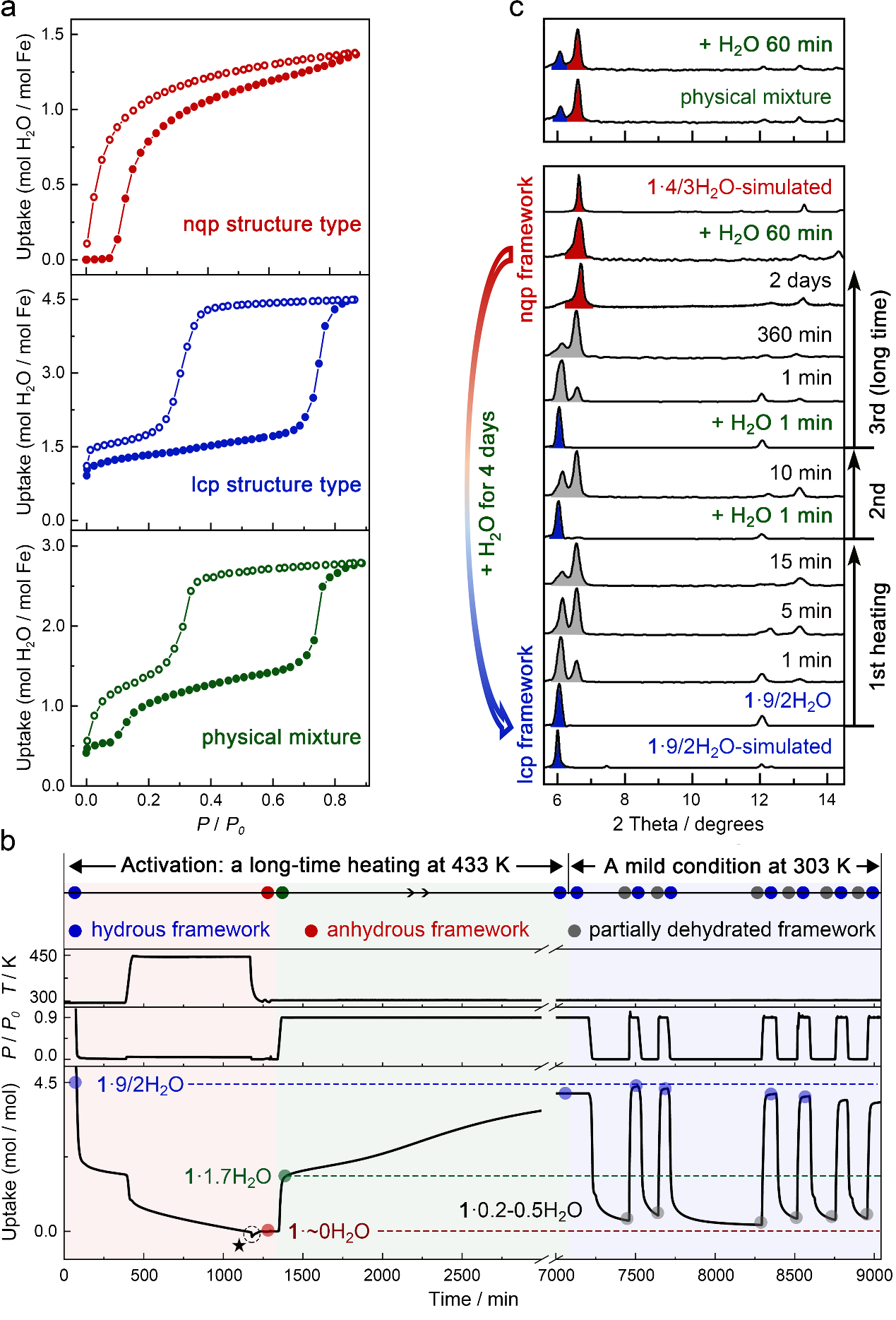 图3 不同活化条件下的吸附等温线、连续的水吸脱附循环和PXRD测试