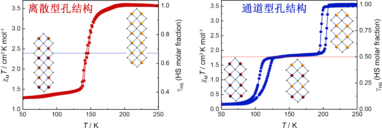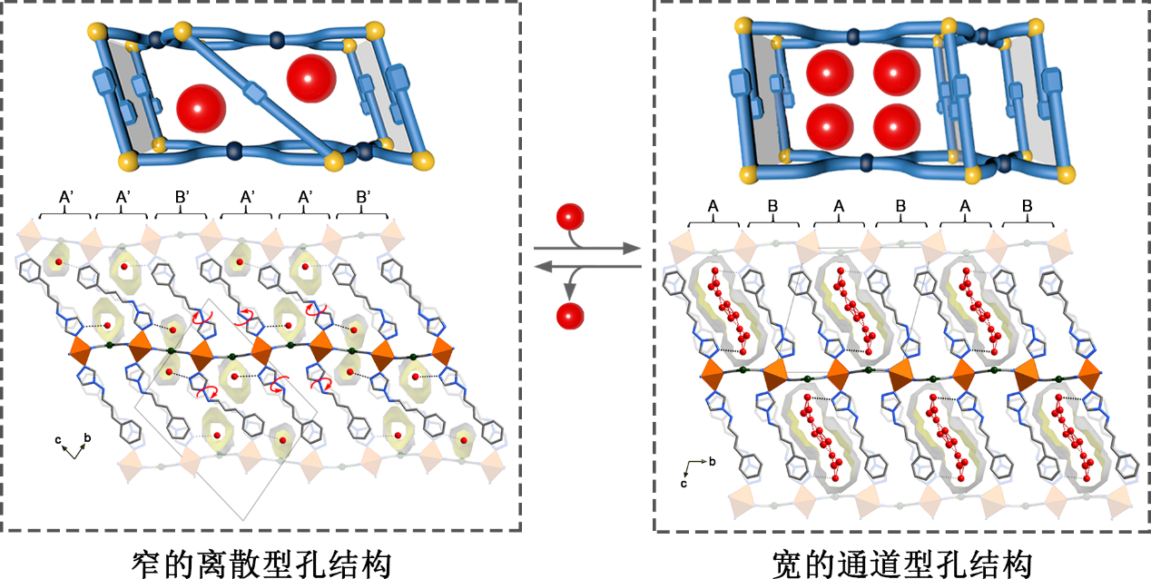 主客体相互作用在实现材料的可切换结构与功能方面发挥着重要作用,但合理的设计与控制仍具有挑战。柔性金属有机框架材料(Flexible metal-organic frameworks, FMOFs)因其结构的可调节性和主客体相互作用的密切关联引起了研究者广泛的关注。在结构转变的过程中,金属中心的配位构型变化有可能导致材料磁学性质的变化。这种磁性多孔材料扩宽了多孔材料的应用前景,并且为主客体相互作用机理的理解提供了新的途径。