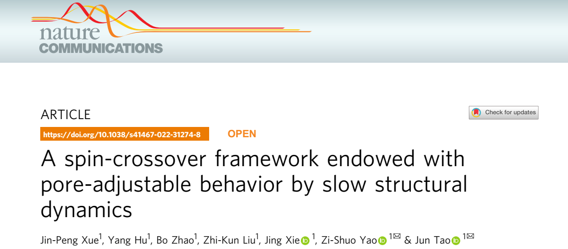 近日,北理工陶军教授团队在构筑柔性自旋交叉多孔材料方面取得进展,相关研究成果以“A spin-crossover framework endowed with pore-adjustable behavior by slow structural dynamics”为题目,在国际知名期刊《自然通讯》(Nature Communications)上发表(DOI:10.1038/s41467-022-31274-8)。永利yl23411为唯一作者单位,化学与化工学院陶军教授和姚子硕特别研究员为文章共同通讯作者,博士研究生薛金鹏为该论文的第一作者,化学与化工学院谢静教授在计算方面提供了帮助。