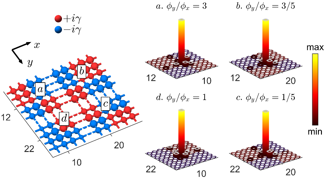 为了给出更加普适的研究方法,研究团队研究了AAH模型、SSH模型、谷光子晶体和C6v类型的光子晶体等多种常见的非厄米拓扑光子学体系,提出了一种通过引入不同畴拓扑态之间耦合系数来构建体系有效哈密顿量的新方法,为研究新型增益-损耗畴壁拓扑光学体系提供了较为普适的研究方案。在由紧束缚哈密顿量H_1D描述的一维AAH构型中,使用拟合的方法确定有效哈密顿量H_eff的相关参数,理论计算发现有效哈密顿量H_eff可以准确的描述相应拓扑态的模式分布与模式频率(图1)。同时,研究团队将该方法推广至高维,通过在二维AAH构型中构造十字形的增益-损耗界面,还实现了由增益-损耗畴壁诱导的拓扑角态,并成功构建出有效哈密顿量分析相应现象,通过适当调整体系参数与体系内的增益损耗分布,可以在二维体系内的不同位置诱导出拓扑角态(图2)。这一工作揭示了由增益-损耗畴壁诱导的拓扑态的产生机制,同时对有源调控拓扑态具有指导意义。