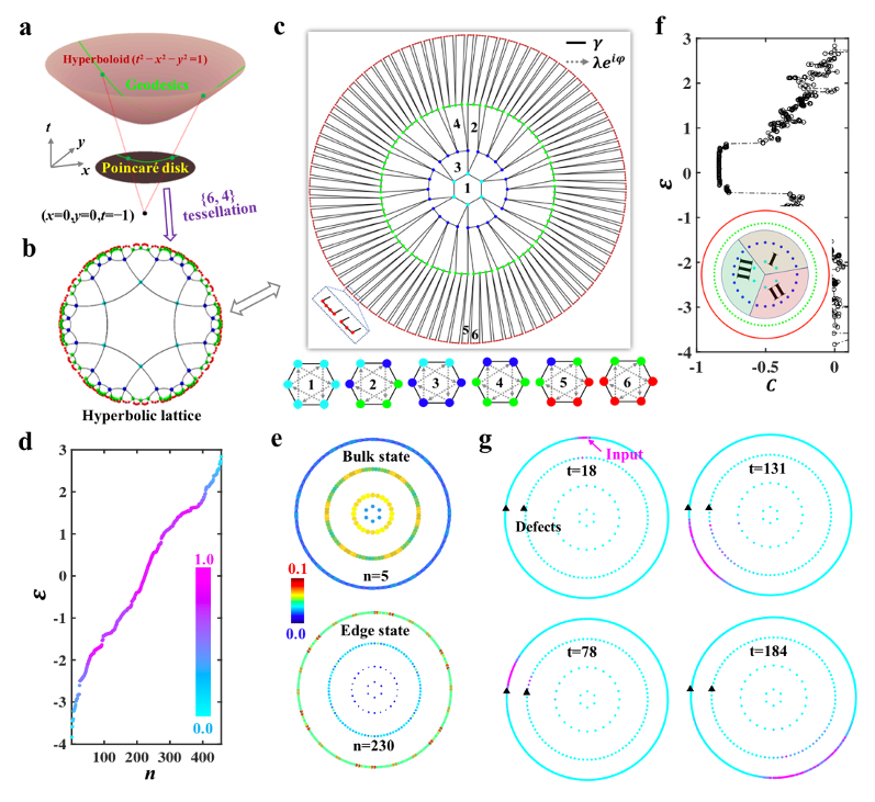为了探究双曲几何和拓扑边界态的相互作用,研究人员首先将Haldane模型直接推广到{6,4}双曲晶格系统中,如图1a-1c所示。简单来讲,就是在{6,4}双曲晶格的每一个六边形结构中,都引入实数最近邻耦合和复数次近邻耦合。新生成的模型被称为双曲Haldane模型。通过直接数值对角化的方法,可以求得有限{6,4}双曲Haldane模型的本征能谱和相应的本征态分布,如图1d和1e所示。可以清晰的看到,能量为零附近的本征态为双曲边界态。为了进一步证明双曲边界态的拓扑属性,研究人员计算了实空间Chern数,如图1f所示。可以看到双曲边界态能谱所对应的实空间Chern数具有非平庸的拓扑平台,说明其具有类似于反常量子霍尔效应的拓扑属性。而实空间Chern数没有达到1是由于有限的格点数目导致的。进一步利用耦合模方程,研究人员研究了双曲边界态的单向拓扑传输特性,如图1g所示。可以清晰的看到,双曲拓扑边界态可以绕过缺陷单向传输。相比于欧氏空间的量子反常霍尔边界态,双曲拓扑边界态具有显著增强的边界响应,即拓扑传输的通道(边界点)数目大于或近似等于体内格点的数目。这一新奇的特性为设计高效的拓扑器件提供了新的途径。