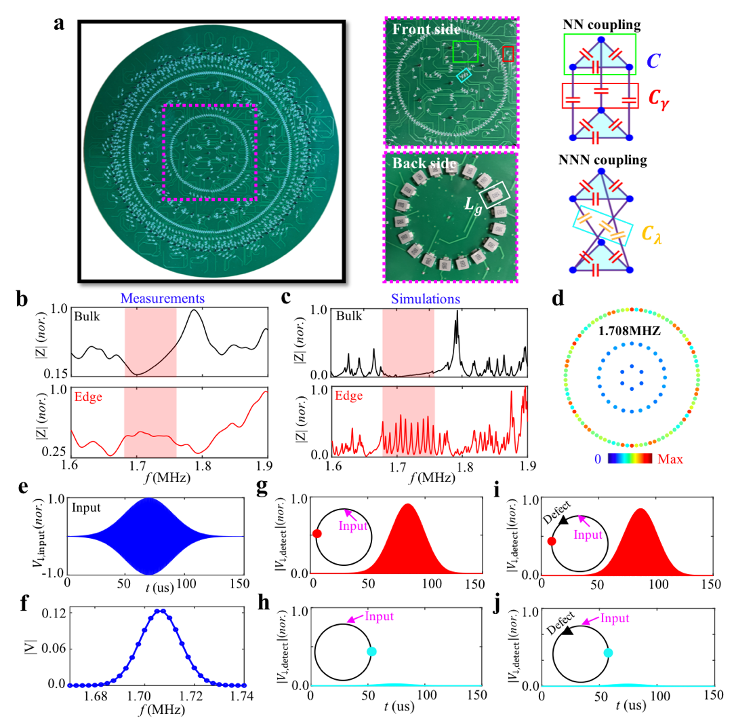 基于凝聚态晶格模型与电子线路网路的一致性,研究人员设计并制备了双曲电路(如图2a所示)来观察边界统治的双曲量子反常霍尔效应。图2b和2c分别对应实验测量和理论仿真的电路阻抗结果。电路格点的阻抗响应对应于双曲量子模型的局域态密度。可以看到,双曲体点在红色区域内没有阻抗峰值,表明存在双曲体带带隙。同时,双曲电路的边界格点在该带隙中存在显著的阻抗峰值,表明拓扑边界态的存在。图2d展示的是边界态所对应频率下的电路阻抗分布图。可以看出其与双曲晶格模型中的拓扑边缘态的概率幅分布完全一致。进一步,研究人员通过测量电压波包在双曲电路网路中的时域特性,清晰地证明了边界统治的双曲边界电压传输,如图2e-2j所示。