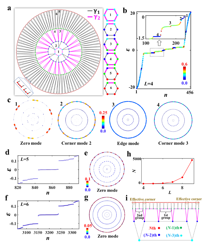 除了一阶双曲量子反常霍尔边界态,研究人员进一步研究了双曲晶格中的高阶零能角态。所设计的双曲晶格模型显示在图3a中,即在{6,4}双曲晶格中引入二值化(黑线和粉线)的层内和层间最近邻耦合。当最外层的耦合强度对应于弱耦合时,高阶角态就会产生。需要指出的是,不同于欧氏空间中0维角点的几何特性,双曲晶格的有效0维角点对应于具有不同耦合方式的最外层格点间的有效界面(如图3i所示)。图3b和3c展示了利用数值对角化方法计算的双曲能谱和相应本征态的空间分布。可以看到双曲零能模的概率分布局域在最外层的0维格点上,展现了高阶拓扑角态的特性。同时,除了零能模,在另外两个能量附近也存在双曲高阶角态。可以发现与欧氏空间的高阶角态性质相似,双曲高阶角态也总是出现在双曲边界态的带隙中。研究人员从三个方面进一步对高阶零模的拓扑性质进行了证明。首先,通过改变二值化耦合强度的相对关系,双曲能谱发生了带隙闭合再打开的过程。同时,该过程伴随着双曲高阶零能模从无到有的变化过程,是拓扑相变的重要特征。其次,双曲高阶拓扑态具有与C6-高阶拓扑绝缘体相同的拓扑相变特点。最后,通过引入无序可以发现双曲高阶零能角态具有很强的鲁棒性,这与双曲晶格中由干涉引起的局域化效应显著不同。另外研究人员计算了不同尺寸下的双曲能谱和本征态的分布,如图3d-3g所示。图3h给出了双曲零能模的数量与双曲晶格尺寸的关系。可以看到通过增大双曲晶格的尺寸,双曲零能模式的数量也急剧增加。该现象与分形几何结构中的高阶拓扑角态相似。需要强调的是,这一新奇的现象是源于双曲晶格独特的边界响应,即边界格点的数目随双曲晶格层数的增加而呈现指数增长的趋势,使得边界有效0维角点也具有指数增长的特点。