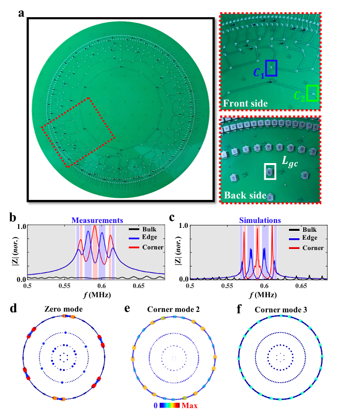 为了在实验上观察双曲高阶零能角态,研究人员设计并制备了相应的双曲电路网络,如图4a所示。图4b和4c分别对应实验测量和理论仿真的电路阻抗结果。可以看到双曲晶格的边界点在蓝色区域所对应的频率范围内有显著的阻抗峰值,而体点在相应频率范围没有阻抗响应,表明双曲边界态存在于双曲体态的带隙中。同时双曲晶格的角点在红色区域内有显著的阻抗峰值,而边界格点在该频率范围没有阻抗峰值。这一现象表明双曲高阶角态存在于双曲边界态的带隙中。为了进一步展现不同双曲高阶角态的空间分布,研究人员对电路的导纳矩阵进行了重构,并利用重构的导纳矩阵得到了不同双曲高阶角态的空间分布图,如图4d所示。可以看出测得的高阶角态分布与双曲晶格模型的结果完全一致。