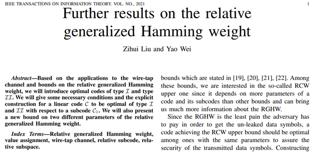 北理工在相对广义汉明重量方面取得新研究成果2021-11-23