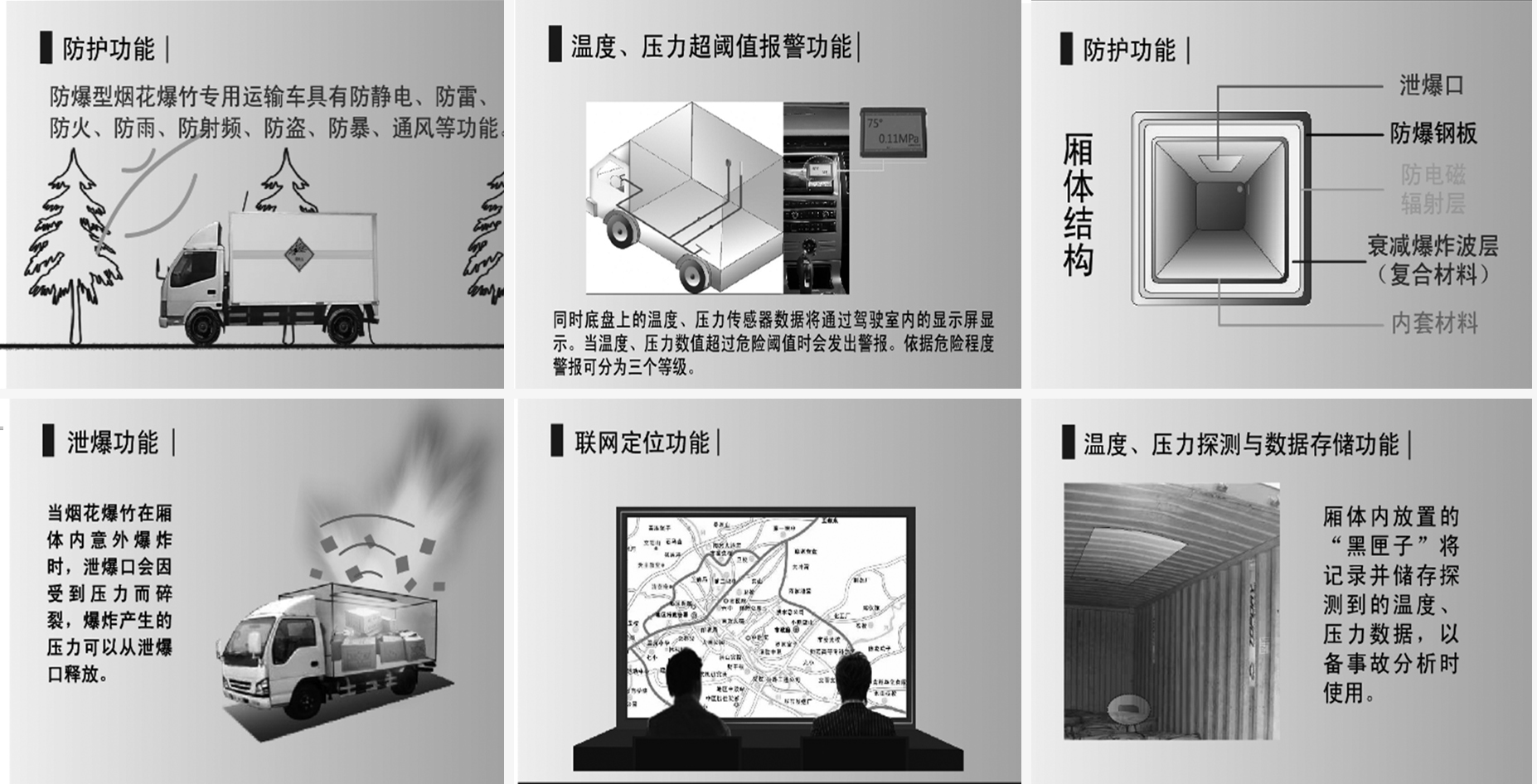 防爆型易燃易爆物品运输车是一种能够实现事故前预警、事故时降低损害程度、事故后根据黑匣子数据分析事故原因的功能全面的防爆型易燃易爆物品运输车。具有一、预警与防护:(1)温度、压力探测与数据存储功能;(2)温度、压力超阈值报警功能;(3)防护功能;二、主动防护,减轻损害:(1)泄爆功能;(2)车厢内防电磁干扰功能;三、事故分析与数据传输:(1)联网定位功能与数据远程传输监控功能;(2)黑匣子功能;四、升级改造:(1)防枪弹射击功能;(2)防生化武器功能,等等。