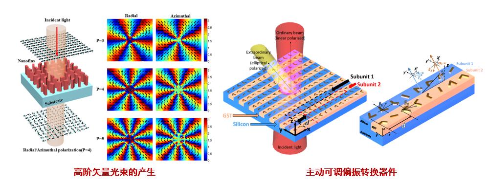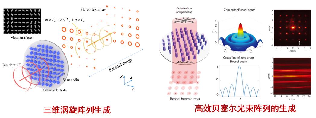 由于超颖表面具有在极短距离内,以亚波长分辨率对出射光的波前进行任意调控的能力,使得它有望成为传统光学元件的替代品。超颖表面体积小、重量轻、具有丰富设计自由度的特点能够大大简化传统光场调控装置的体积以及复杂度。近些年来,项目组在超颖表面的光束整形与偏振调控领域做出了许多有意义的工作。通过将达曼光栅原理与超颖表面相结合实现了三维涡旋阵列以及贝塞尔光束阵列的产生。利用相变材料、Ω形天线以及介质纳米柱结构实现了对出射光束偏振态的调控,并将其应用于矢量光束的产生之中。同时,基于超颖表面对出射光的复振幅调制实现了近场表面等离激元的操控以及远场衍射级次的选择性激发。